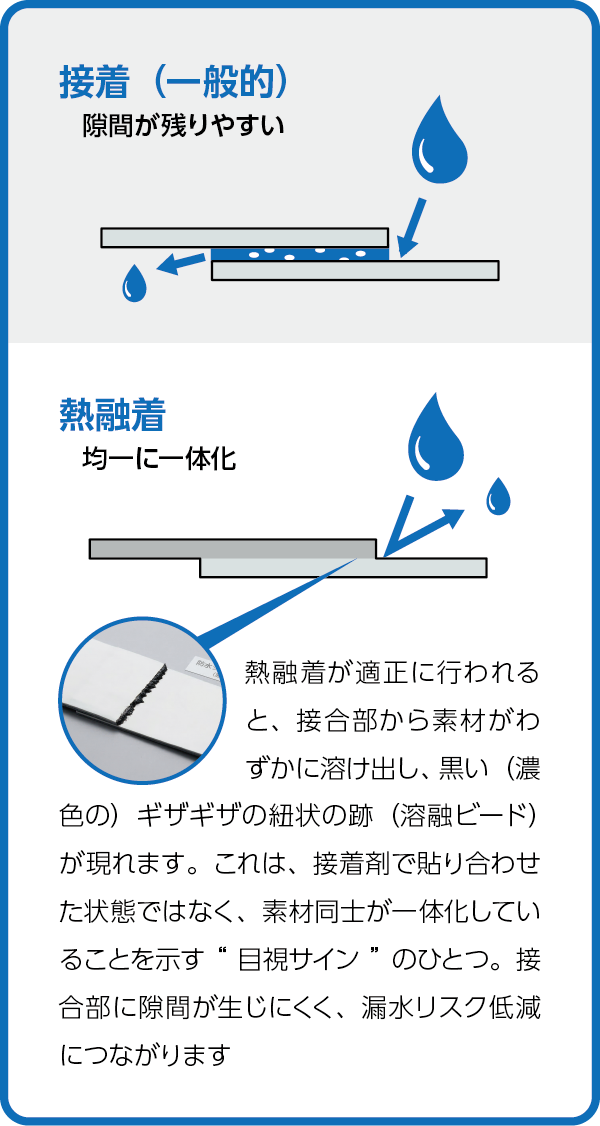 専用の熱風機でシート同士を溶かしてつなぐ「熱融着」を採用。接着のように層を貼り合わせるのではなく素材が一体化するため、接合部に隙間が生じにくく、漏水リスクを低減します。